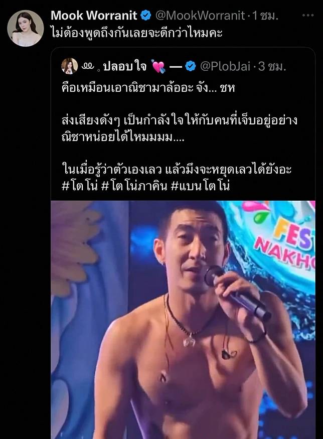 ขณะที่ “มุก วรนิษฐ์” เพื่อนสนิทของ “ณิชา ณัฏฐณิชา” ได้แชร์โพสต์นึง ที่เขียนข้อความว่า.. “คือเหมือนเอาณิชามาล้ออะ จัง… ชห ส่งเสียงดังๆ เป็นกำลังใจให้กับคนที่เจ็บอยู่อย่างณิชาหน่อยได้ไหมมมม…. ในเมื่อรู้ว่าตัวเองเลว แล้วมึงจะหยุดเลวได้ยังอะ #โตโน่ #โตโน่ภาคิน #แบนโตโน่”