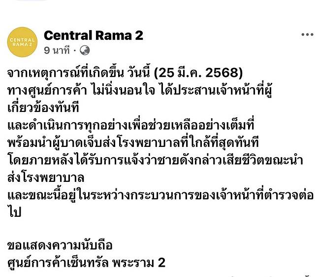เมื่อเวลา 16.00 น.วันที่ 25 มี.ค.68 พ.ต.ท.ทศพล ปานกัล รอง ผกก.(สอบสวน) สน.ท่าข้าม รับแจ้งเหตุคนกระโดดที่สูงเสียชีวิต ภายในห้างสรรพสินค้าแห่งหนึ่ง ย่านพระราม 2 แขวงแสมดำ เขตบางขุนเทียน กทม. จึงไปตรวจสอบพร้อมแพทย์นิติเวช รพ.ศิริราช เจ้าหน้าที่กองพิสูจน์หลักฐาน และอาสามูลนิธิร่วมกตัญญู