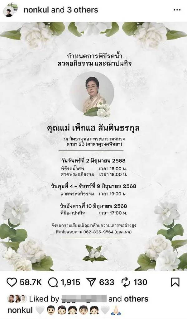นักแสดงหนุ่ม นนกุล ชานน แจ้งข่าวบีบหัวใจ หลังต้องสูญเสียบุคคลสำหคัญของครอบครัว คุณแม่เพ็กแฮ สันตินธรกุล เสียชีวิตลงอย่างสงบแล้ว เตรียมจัดพิธีบำเพ็ญกุศลที่วัดธาตุทอง พระอารามหลวง โดยจะมีพิธีฌาปนกิจในวันที่ 10 มิ.ย. ที่จะถึงนี้