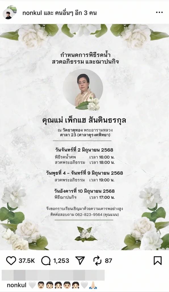 วงการบันเทิงร่วมแสดงความเสียใจอย่างสุดซึ้งกับนักแสดงหนุ่มชื่อดัง“นนกุล ชานน สันตินธรกุล” หลังเจ้าตัวออกมาแจ้งข่าวเศร้าผ่านโซเชียลมีเดียว่า คุณแม่ผู้เป็นที่รัก คุณแม่เพ็กแฮ สันตินธรกุล ได้จากไปอย่างสงบ โดยนนกุลได้ระบุรายละเอียดกำหนดการพิธีรดน้ำศพและสวดอภิธรรมคุณแม่เพ็กแฮ ณ วัดธาตุทอง พระอารามหลวง ศาลา 23 (ศาลาดุรงพิทยา) ซึ่งมีการจัดพิธีสวดอภิธรรมตามประเพณี