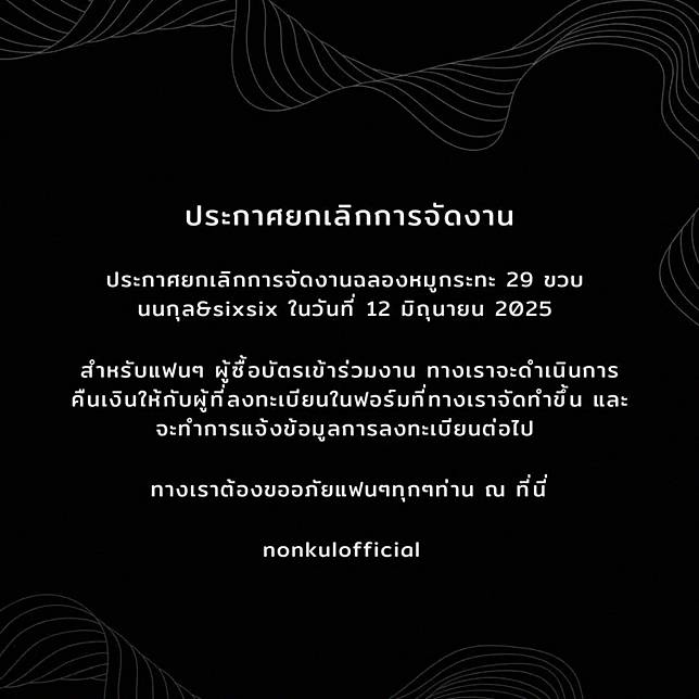 ทั้งนี้ นนกุล ได้ออกมาประกาศผ่านทางเพจเฟซบุ๊ก “Nonkul” อย่างเป็นทางการ เพื่อขอยกเลิกการจัดงาน “ฉลองหมูกระทะ 29 ขวบ นนกุล&sixsix” ในวันที่ 12 มิถุนายน 2568 พร้อมทั้งแจ้งรายละเอียดและขั้นตอนการขอคืนเงินค่าบัตรเข้างาน โดยระบุว่าจะปิดฟอร์มลงทะเบียนขอเงินคืนในวันที่ 15 มิถุนายน 2568