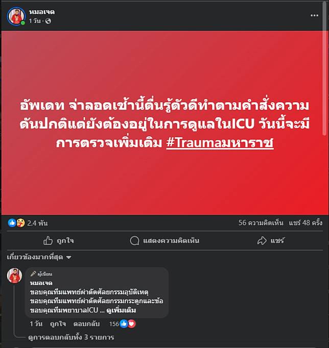 จากกรณีอุบัติเหตุรถยนต์โตโยต้าฟอร์จูนเนอร์ ตกลงร่องกลางสะพานบนทางหลวงพิเศษระหว่างเมือง M6 บางปะอิน-นครราชสีมา ช่วงหลักกิโลเมตร 155 ขาเข้า กทม. บริเวณบ้านหนองรี ต.สีคิ้ว อ.สีคิ้ว จ.นครราชสีมา ส่งผลให้มีผู้บาดเจ็บเป็นชาย 3 ราย โดยทั้งสองคนได้รับบาดเจ็บไม่สาหัส ทางด้าน ด้งเด้ง หรือจ่าลอด นักแสดงภาพยนตร์เรื่อง “สัปเหร่อ” จากไทบ้าน เดอะซีรีส์ บาดเจ็บสาหัส โดยเมื่อวันที่ 10 พ.ค.68