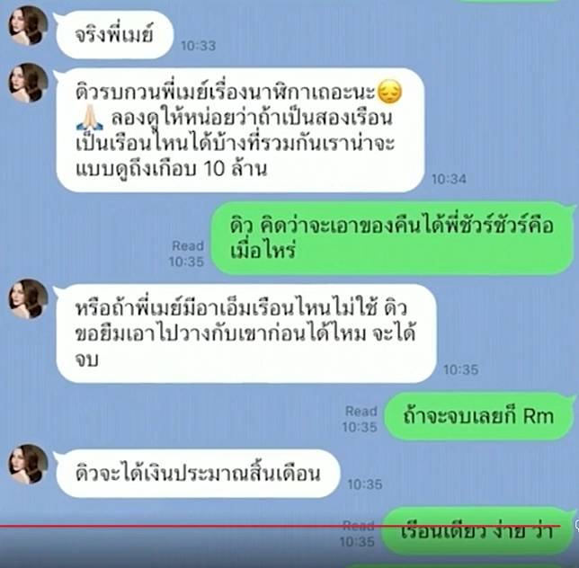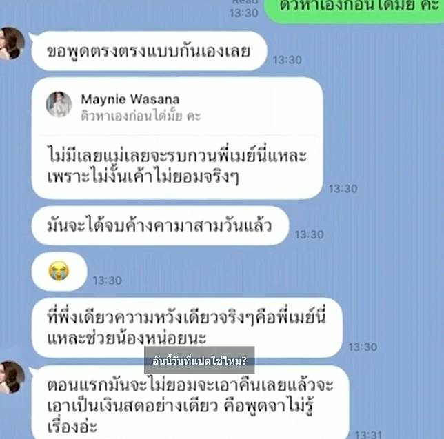 เรารู้จักร้านที่รับไป เพราะเราให้เกียรติ จนเรามารู้ความจริงจากแชท และดีเอ็มหาน้องคนนั้น ซึ่งคนนั้นรอการติดต่อมาตลอด เพราะเขาถูกอ้าง ดิวกล่าวหาว่าเมย์ลำบาก ไม่มีเงิน ซึ่งร้านรู้ว่าเป็นของเมย์ เขากลัวตอนเห็นข่าว เลยไปลงบันทึกประจำวัน 20 ม.ค. เพราะกลัวว่าเรื่องนี้จะถึงตัวเขา (หนุ่ม : อ่านใบแจ้งความ) ซึ่งของบางส่วนรู้แล้วอยู่ที่ใคร ขอให้ติดต่อมาเพื่อหาทางออกกัน