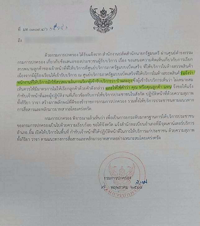 เนื่องจากมีผู้ร้องเรียนได้เข้ารับบริการ ณ ศูนย์บริการภาครัฐแบบเบ็ดเสร็จที่ให้บริการในห้างสรรพสินค้า แจ้งว่า พนักงานที่ให้บริการมักใช้สรรพนามในการเรียกผู้เข้ารับบริการว่า “ป้าและลุง” ซึ่งผู้เข้ารับบริการเห็นว่า “ไม่เหมาะสม” เห็นควรให้มีมาตรการไม่ให้เรียกลูกค้าด้วยคำดังกล่าว และให้ใช้คำว่า “คุณ” หรือ “คุณลูกค้า” แทน จึงขอให้แจ้งกำชับเจ้าหน้าที่และผู้ปฏิบัติงานที่เกี่ยวข้องกับการให้บริการประชาชนในสังกัด ปฏิบัติหน้าที่ด้วยความสุภาพทั้งกิริยา วาจา สร้างภาพลักษณ์ที่ดีของข้าราชการกรมการปกครอง รวมทั้งให้บริการประชาชนตามแนวทางการสื่อสารและหลักมารยาทสากลโดยเคร่งครัด
