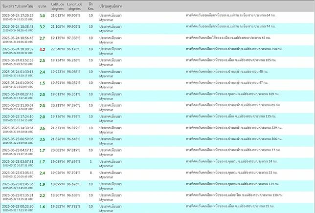 2025-05-24 10:08:32 | แรงสั่นสะเทือนขนาด 4.2 แมกนิจูด ศูนย์กลางที่ ประเทศเมียนมา ลึกลงไปจากพื้นดินประมาณ 10 กิโลเมตร ทางทิศตะวันตกเฉียงเหนือของ อ.ปางมะผ้า จ.แม่ฮ่องสอน ประมาณ 398 กม.