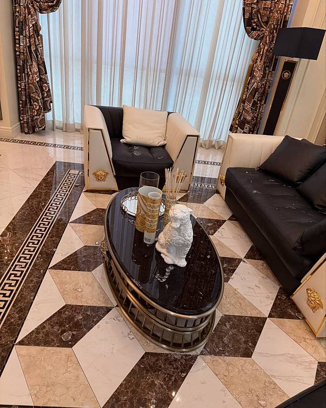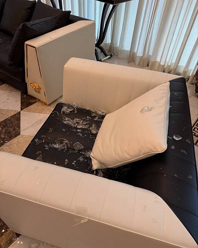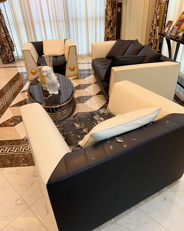 จากภาพที่โพสต์ผ่านช่องทางส่วนตัว พบว่าเพนต์เฮาส์สุดหรูที่ตกแต่งด้วยเฟอร์นิเจอร์นำเข้าระดับไฮเอนด์จากแบรนด์ Versace ได้รับความเสียหายอย่างหนัก ทั้งเพดานที่ร้าว ผนังแตกร้าวเป็นแนวยาว และของตกแต่งระดับมาสเตอร์พีซที่หล่นกระจัดกระจายเต็มพื้น