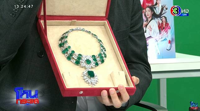 ผู้สื่อข่าวรายงานว่า สำหรับสร้อยเส้นนี้คือ สร้อย Lotus Arts De Vivre รุ่น: Zambian Emerald & Diamond Necklace มูลค่า: 26,440,000 บาท ของไฮโซเมย์ วาสนา