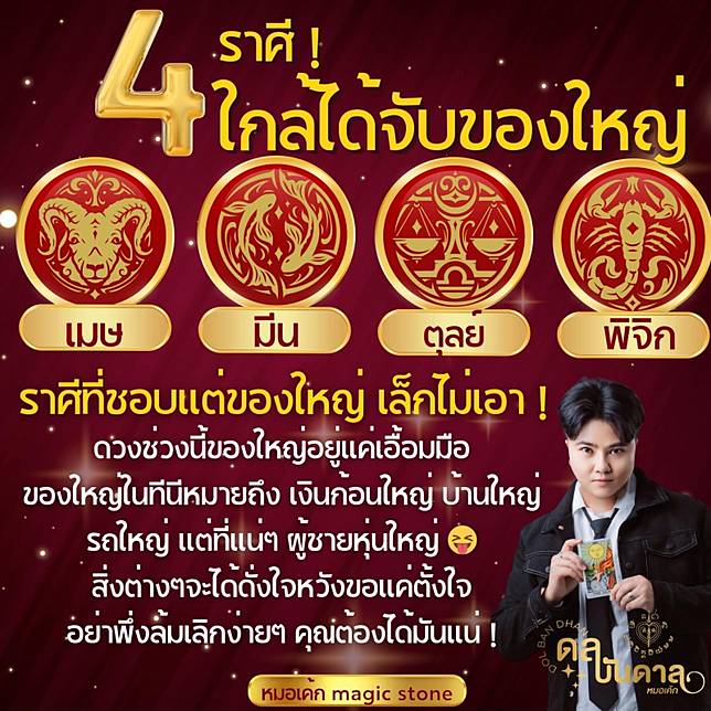 หมอเค้กMagic stone เผยในเพจถึงดวง 4 ราศี ใกล้ได้จับของใหญ่ ดวงช่วงนี้ของใหญ่อยู่ในเอื้อมมือ ของใหญ่ในที่นี้หมายถึง เงินก้อนใหญ่ บ้านใหญ่ รถใหญ่ แต่ที่แน่ๆ ผู้ชายหุ่นใหญ่ สิ่งต่างๆ จะได้ดั่งใจหวัง ขอแค่ตั้งใจ อย่าพึ่งล้มเลิกง่ายๆ คุณต้องได้แน่ๆ